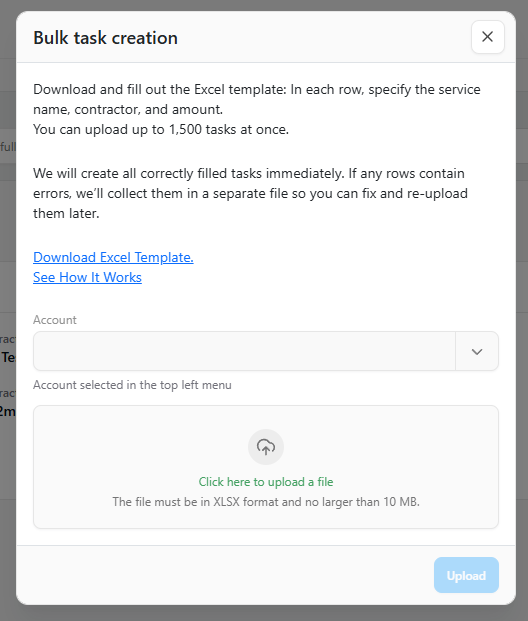 Bulk task upload is a tool that lets you upload up to 1,500 tasks using a single Excel file. It's especially useful for clients handling large volumes of tasks, helping to significantly reduce manual work.