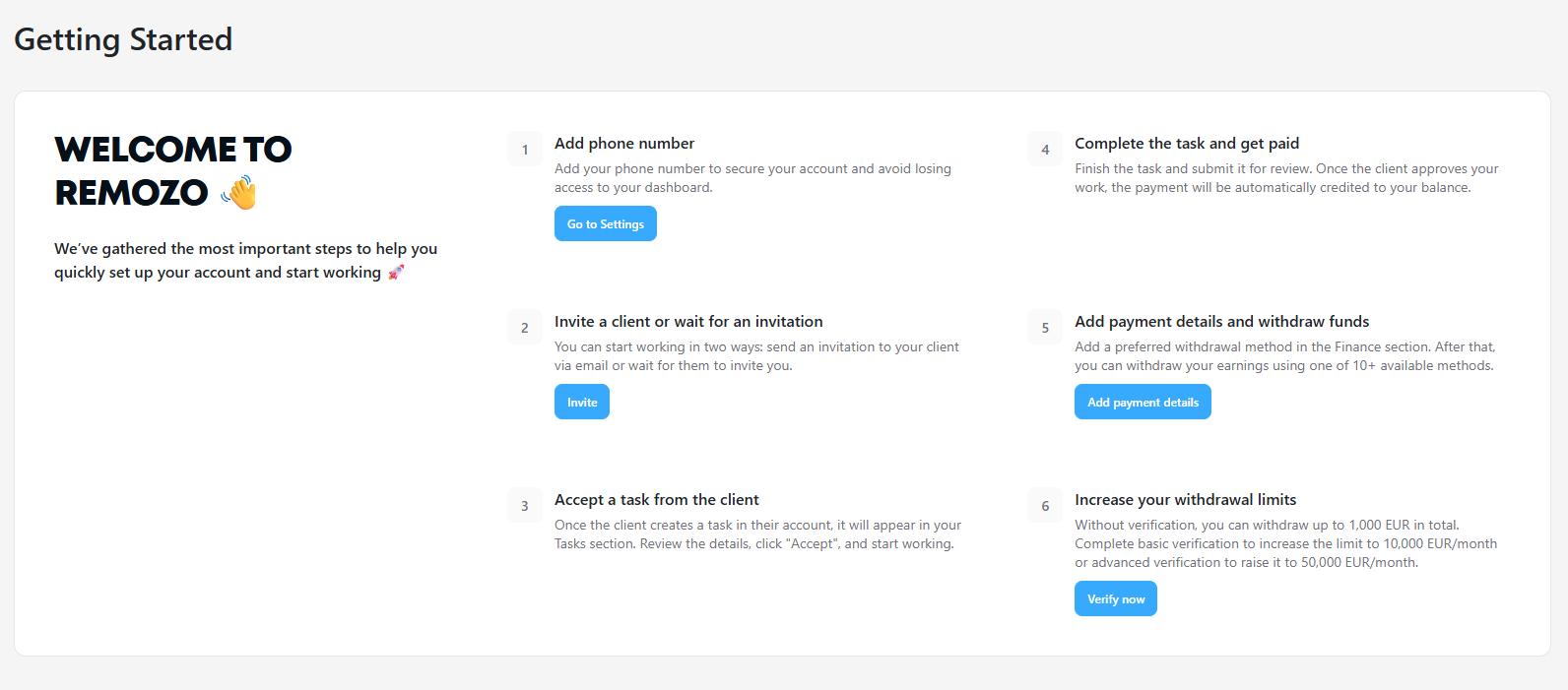 If a contractor has not added a phone number, or if the number has been added but not confirmed, a prompt to add and confirm the phone number will appear on the “Getting Started” page.